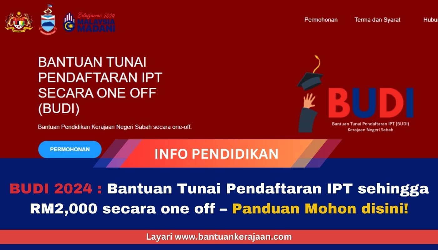 Kerajaan Negeri Sabah terus komited dalam membantu pelajar-pelajar Sabah melanjutkan pengajian mereka ke peringkat lebih tinggi melalui inisiatif Bantuan Tunai Pendaftaran Institusi Pengajian Tinggi (BUDI). BUDI adalah satu bentuk bantuan kewangan yang diberikan secara one-off kepada pelajar Sabah yang layak, bertujuan untuk meringankan beban kewangan mereka semasa memulakan pengajian di IPT.